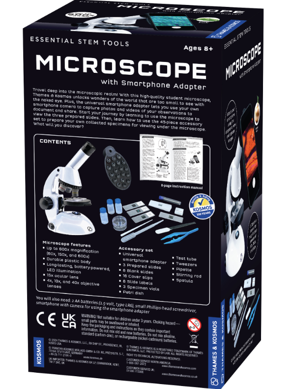 Dive into the Microscopic World!ย With this top-notch student microscope from Thames & Kosmos, you can explore the hidden wonders that are invisible to the naked eye. The universal smartphone adapter allows you to use your smartphone camera to capture and share photos and videos of your discoveries. Begin your adventure by learning to use the microscope with the three prepared slides. Then, utilize the 45-piece accessory set to prepare your own specimens for observation. What will you uncover?