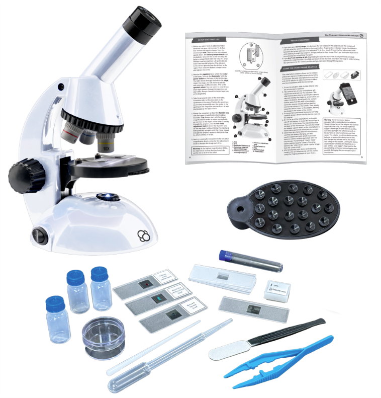 The microscope features a 15x eyepiece lens that works in conjunction with three objective lenses, providing total magnification powers of 60x, 150x, and 600x. It includes a battery-powered LED light to illuminate your specimens. The kit comes with slides, cover slips, and various tools for collecting and preparing specimens. The instruction manual offers detailed guidance on using the microscope and its tools. The smartphone adapter is highly adaptable and compatible with almost any smartphone.