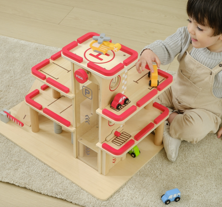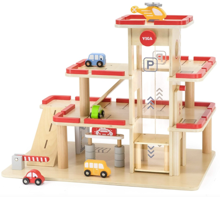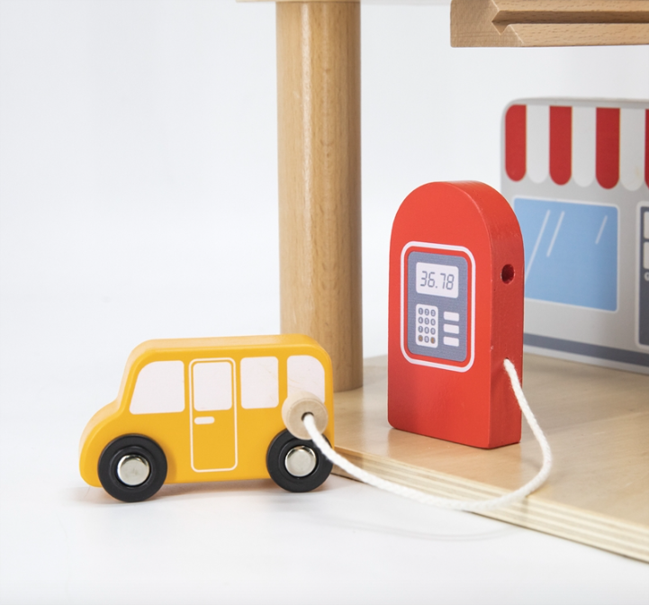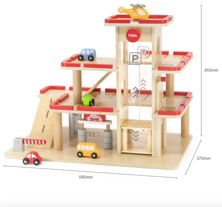 This multi-level parking and gas station is every child's dream! Kids love to wheel their little cars around a busy station while learning about transportation. Featuring a clear panoramic lift, 4 cars, and a helicopter, it’s designed for hours of action-packed fun.