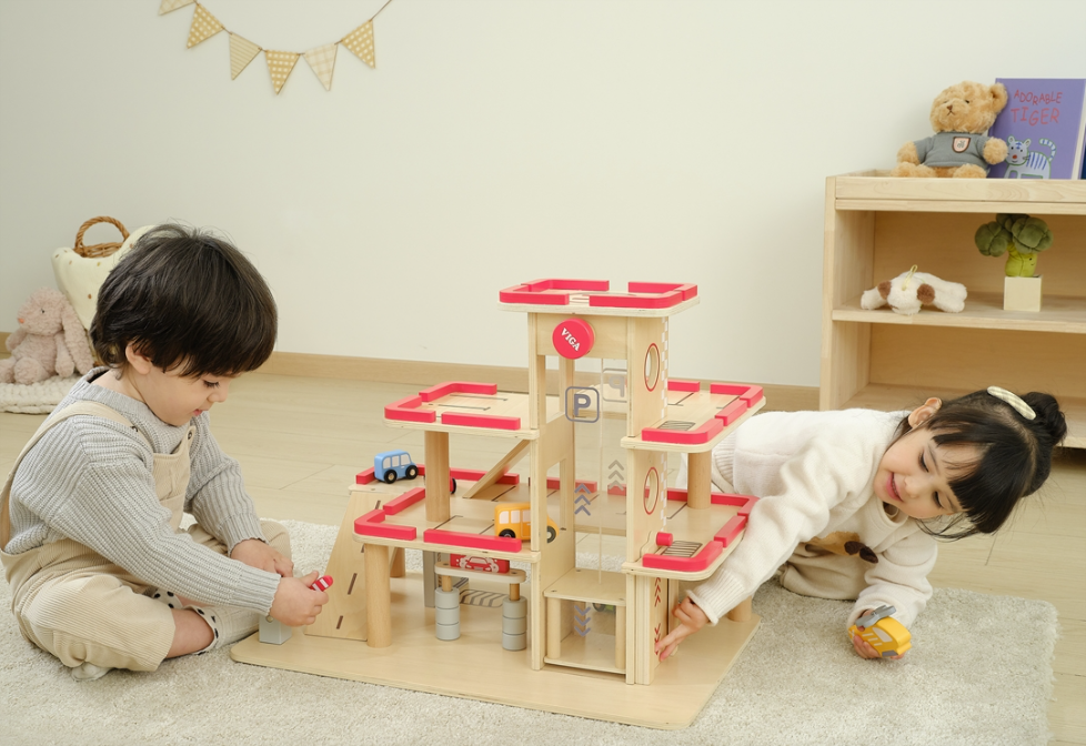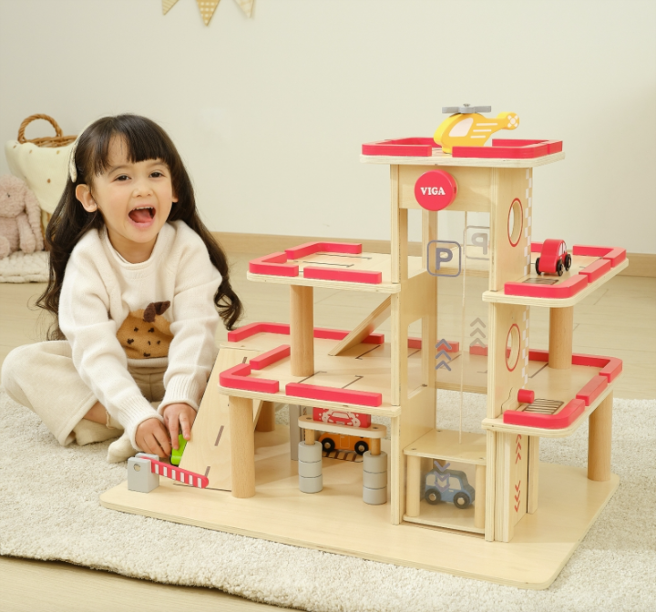 Children can watch the cars move up and down in the lift through the transparent plexiglass panels, adding excitement to every ride. A magnet holds the lift door securely at the top level, while the spacious layout and generous floor heights make it easy for children to play from all sides.