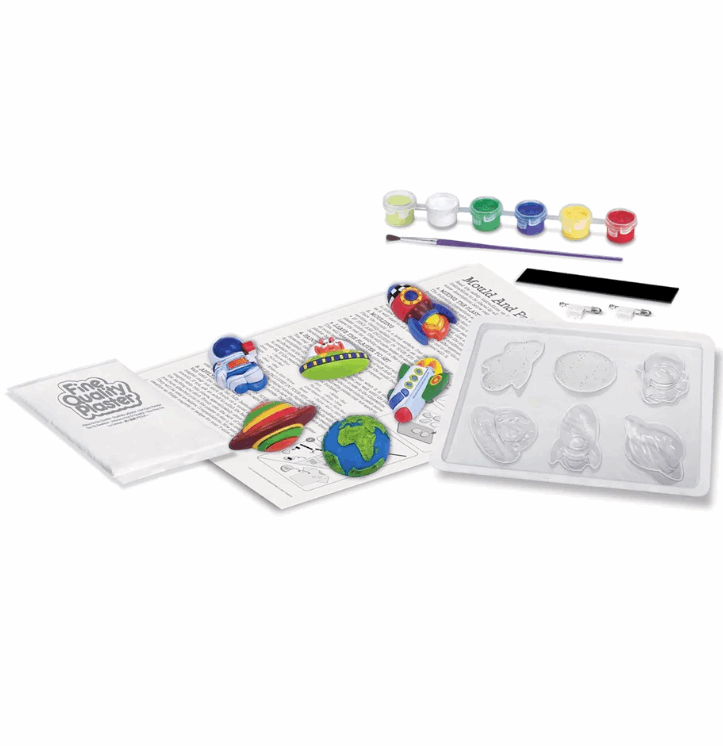 Make your own space inspired magnet or pins by using the mould, plaster, paints and brush included in the kit.
