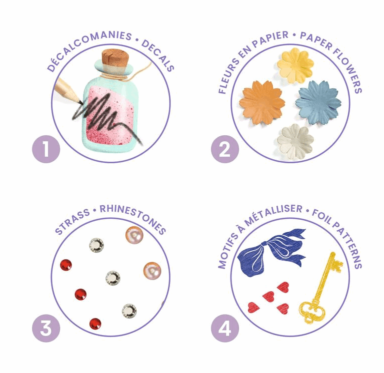 Adorn each board with decals, paper flowers, self-adhesive rhinestones, and foil patterns for four times the creative fun and an impressive result.