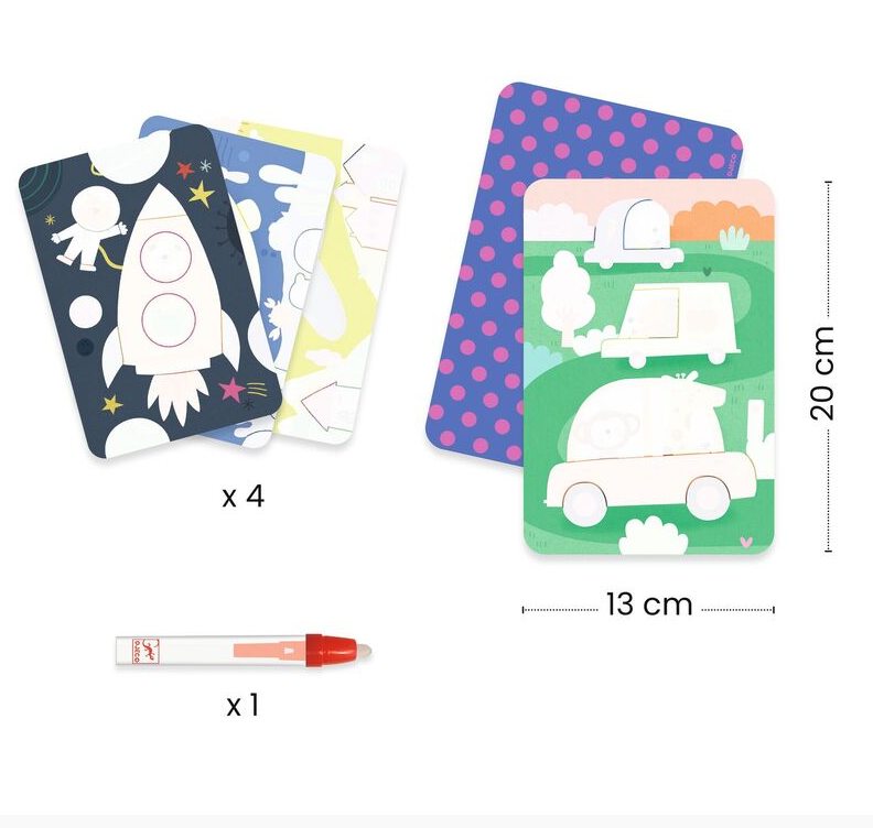 Contents: 4 soft-plastic illustrated boards (13 x 20 cm) with a white layer that disappears, 1 water-filled pencil and 1 thick-card base.