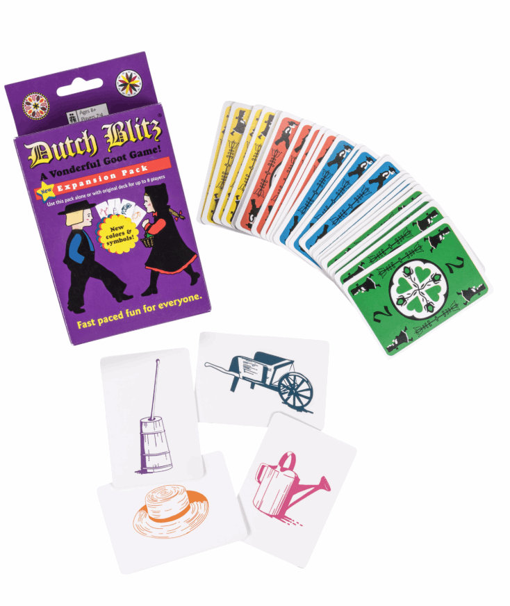 Enter the enhanced, Purple Dutch Blitz Expansion Pack with 4 new colors, and 4 new symbols! Folks can still use each deck separately, but now, when 5-8 play together, players' decks are more distinct and identifiable, making “Double Dutch” even faster!