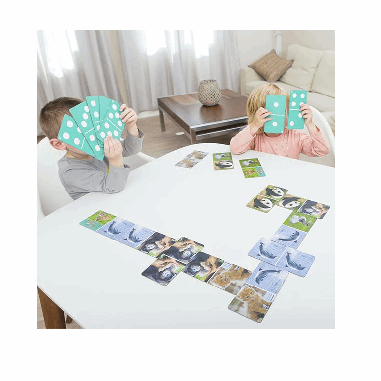 A domino of large pieces so that the little ones can manipulate them. They are double-sided, which allows you to play in two ways: on one side, joining the classic dominoes. And on the other, uniting the photos of animals. The first way to play: the first player starts by playing cards with the same animals on both ends, the rest of the players take turns sending out cards from their own hands to play solitaire by connecting the previous animals with the same ones.