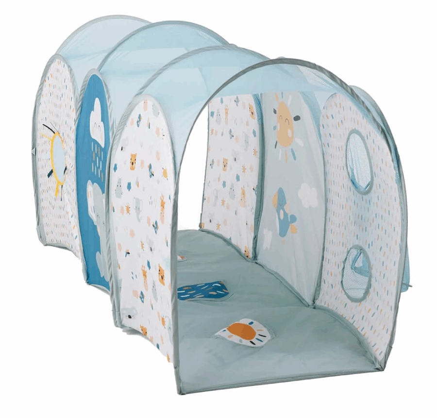 The base is padded so that they do not get hurt when sitting and crawling and is designed to minimise the rotation of the tunnel. In addition, it can be assembled and disassembled in a moment thanks to its pop-up system. Characteristics: With different activities designed to stimulate their senses and develop their motor skills. Includes 3 bright yellow, dark blue and light green balls to stimulate visual development, to play with the basket or roll them.
