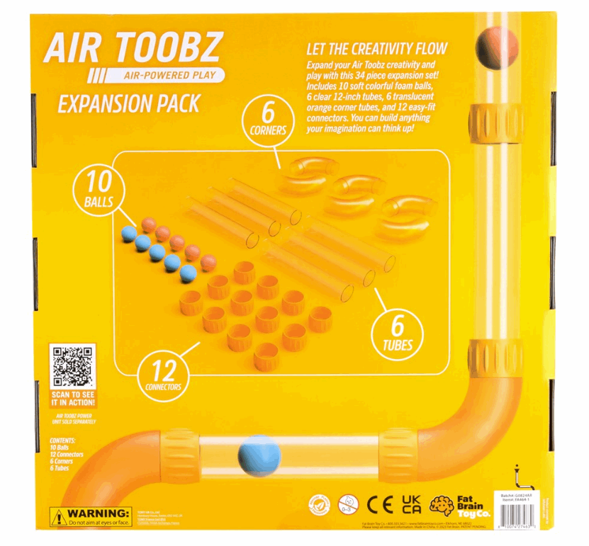 This expansion pack comes with enough tubes and connectors to double the length of your Air Toobz build, plus 10 extra balls to keep the fun flowing. Explore and experiment even more endlessly with the Air Toobz Expansion Pack!