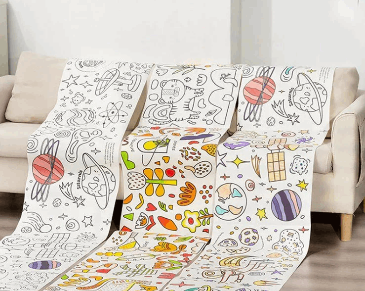 This painting roll features a removable adhesive that easily sticks to walls, boards, and tabletops for creative drawing, and it can be torn off without leaving any marks. With a tearable line every 60 cm, the full-length painting roll measures 5 meters long and showcases non-repeating graffiti, allowing children to immerse themselves in their artistic world, much like watching animations. Made from thickened beige eye-protecting double-glue paper without added fluorescent agents, it creates a comfortable visual environment. The colours are long-lasting and compatible with a wide range of painting products.