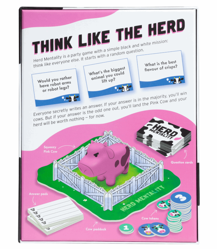 This is a party game for families, friends, and cow rustlers. The aim of the game is simple: think like the herd and write down the same answers as your friends.