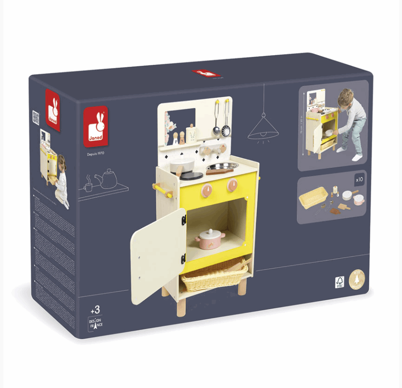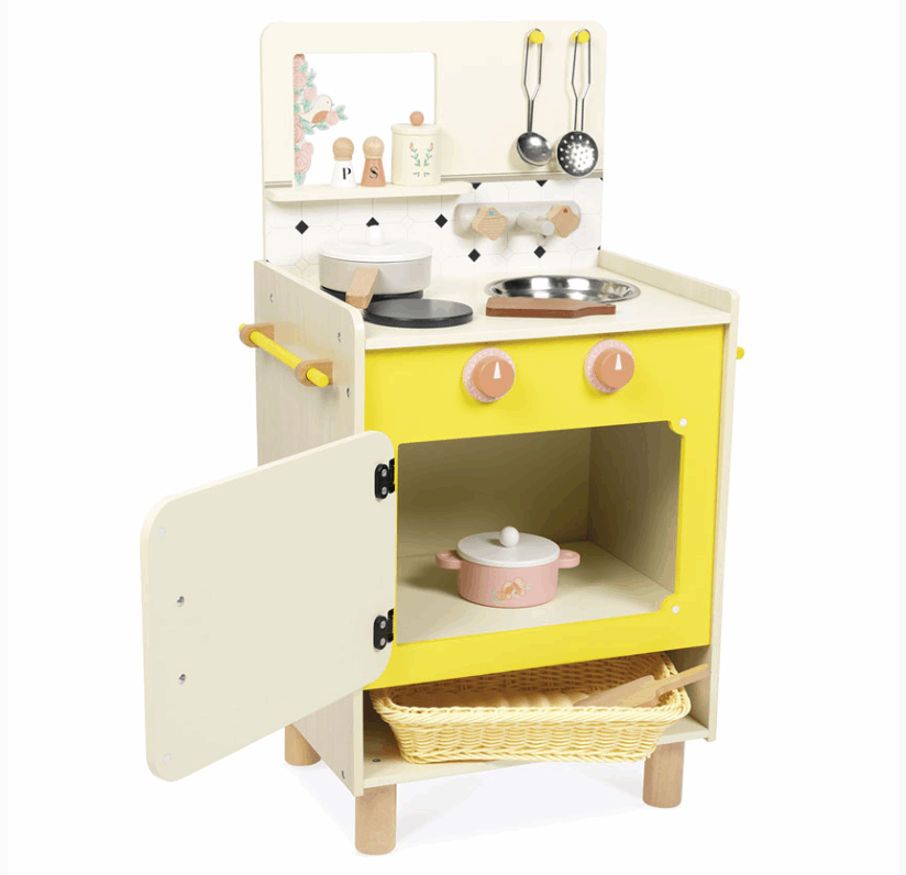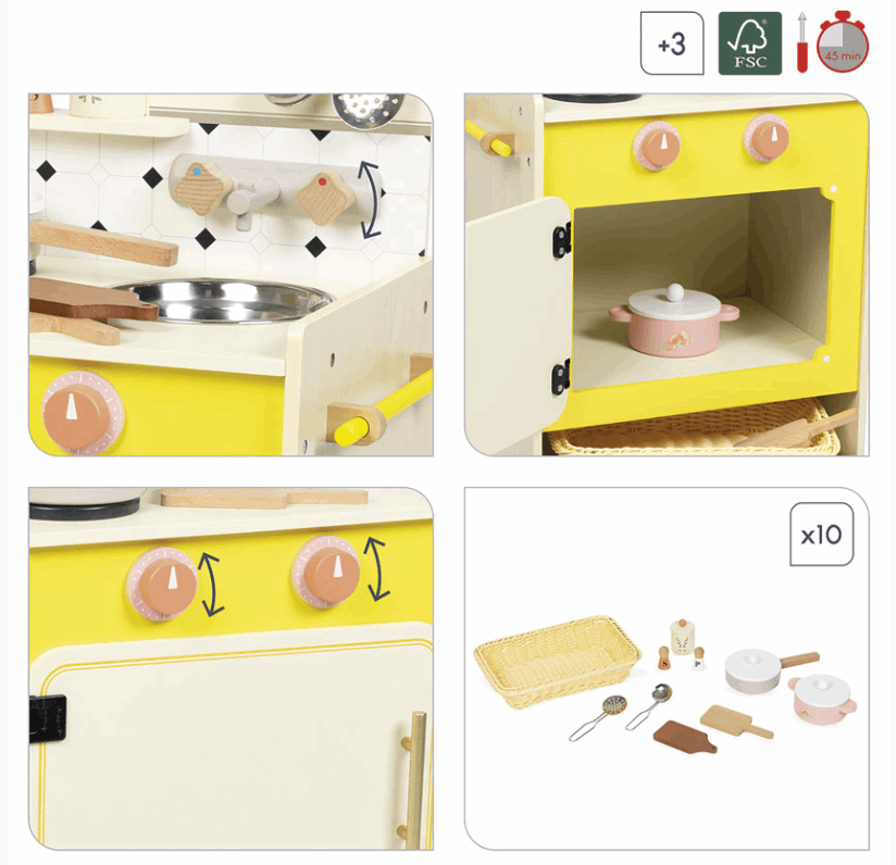 Step into the heart of family traditions with the Sunshine Kitchen, a delightful play kitchen designed to whisk little ones into a world of culinary creativity and imaginative fun. Inspired by the timeless charm of a country kitchen, this compact wooden set brings nostalgia and playfulness together in perfect harmony. Its compact size ensures it fits snugly in any play space, yet it?s packed with thoughtful features and accessories to keep budding chefs entertained. This kitchen is made from eco-friendly FSC certified wood, and comes with 10 play essentials, including 2 cutting boards, a frying pan, saucepan, skimmer, ladle, salt and pepper shakers, a spice jar and a large basket. Watch as your child prepares ingredients, simmers imaginary stews, and seasons their dishes to perfection, all while inventing captivating stories.