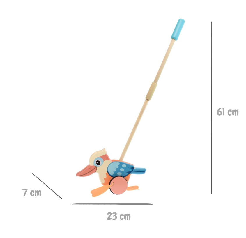 Meet the delightful Push Along Kookaburra from Kaper Kidza charming little bird ready to flutter along in front of your little one! Crafted from smooth, sturdy timber and painted in gentle pastel tones, this sweet kookaburra invites tiny hands to give it a gentle push with the handle and watch it waddle happily across the floor. Perfect for encouraging toddlers to take their first steps, this friendly bird helps build core strength, balance, and spatial awareness through playful movement. Finished with the highest care and coated in child-safe, non-toxic paint, the Push Along Kookaburra is more than just a toyit's a joyful companion on every adventure, bringing smiles and confidence as your child learns to explore their world one step at a time!