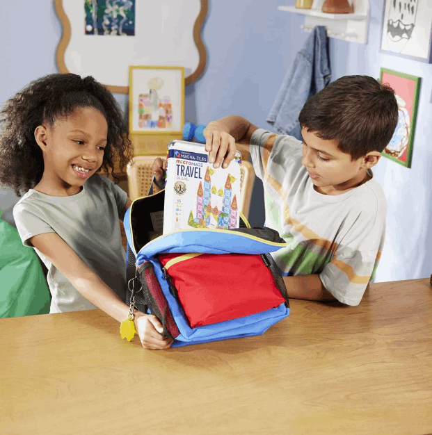 The original 26-Piece Travel Set was such a sensation that we had to dream bigger! This larger, 55-Piece version takes on-the-go play to the next level! Perfect for car rides, vacations, restaurants and beyond, this set features a convenient travel case so you can bring magnetic fun wherever life takes you. With tiles 75% smaller than traditional MAGNA-TILES, it is perfectly sized for portability. Fully compatible with all MAGNA-TILES sets, you can seamlessly expand your collection for frustration-free building fun. Designed with signature safety features like fastening rivets and lattice design, the Travel Set keeps playtime secure while enhancing fine motor skills, problem-solving and hands-on STEM leaning. Bigger, better and ready for adventure, the 55-Piece Travel Set Deluxe is your ultimate companion for imaginative fun on the go!
