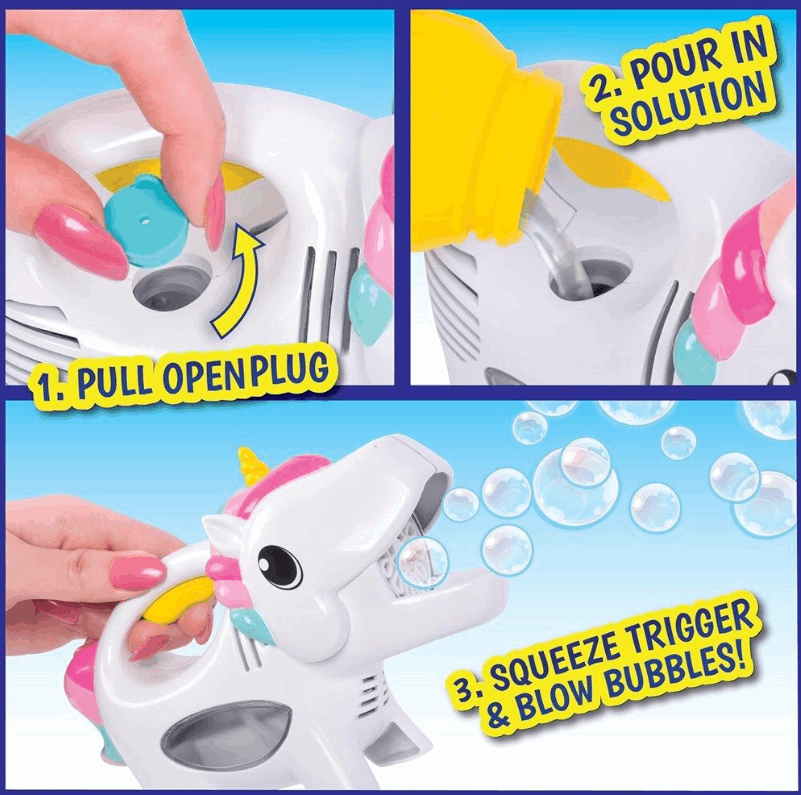 Unleash a tidal wave of bubbly fun with the Maxx Bubbles Unicorn Bubbler! At first glance it looks like just a cute, friendly sea creature with a big grin, but this playful shark has a surprise in store. Just squeeze the handle, and watch as the shark’s mouth opens wide to unleash a thrilling stream of bubbles accompanied by fun sounds, turning any backyard or beach day into a sea of laughter and fun. Perfect for kids ages 3 and up, this interactive bubble blower is ideal for keeping little ones engaged and excited, whether at a summer pool party, a backyard family gathering, or during everyday outdoor playtime. Durable and easy for little hands to hold and use, this adorable shark bubbler is built to bring endless delight wherever it goes. With 4-ounce bottle of premium, non-toxic bubble solution included, you'll be having a bubble blowing fun in no time! Get ready to give into bubble fun with Maxx Bubbles!