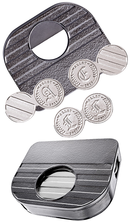 The Huzzle 4-19 Cast Wallet Puzzle. Six coins are trapped inside the wallet, interlocked in three pairs and they wont come out easily. Slide to discover how to take the coins out. Designed by Japanese puzzle designer Koichi Miura. Difficulty is level 4.